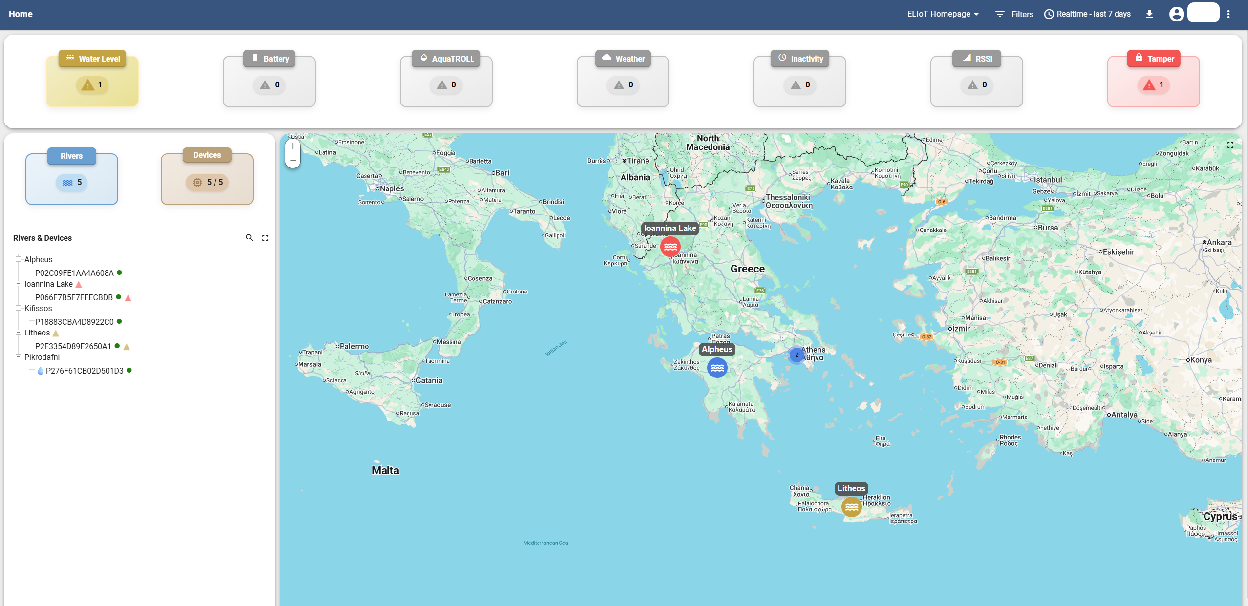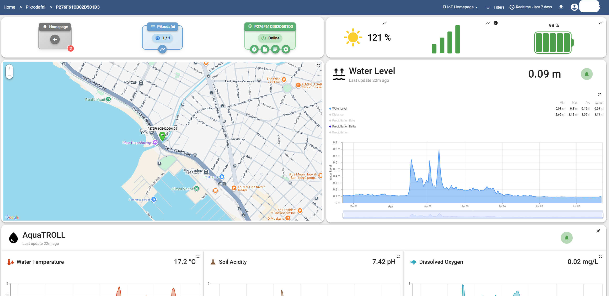 Open ELIoT provides live data for three rivers in Greece, publicly accessible in real time. The Pikrodaphni deployment — the first of its kind in the country — demonstrated that affordable, open, real-time water monitoring is achievable at scale.